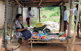 Schulmensa; Mütter besorgen Lebensmittel und verkaufen sie in der Mensa; Unterricht im Freien außerhalb der Regenzeit